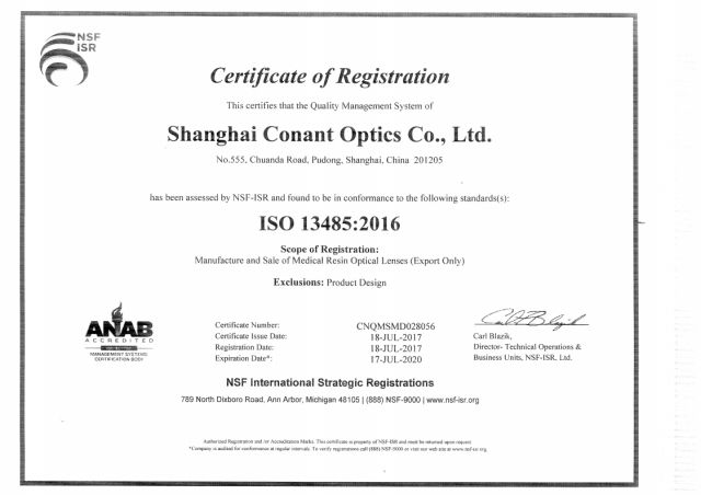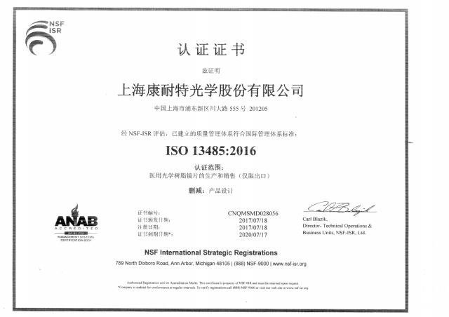此次获得获得ISO13485认证证书,表明康耐特镜片符合医疗器械的标准,高度认可了康耐特镜片的质量,且已受到市场权威认可,是对产品质量水平的有力证明,更有利于提高和改善企业的管理水平,增加企业的知名度,进一步完善公司知识产权保护体系,形成持续创新机制,加大市场开拓,从而增强公司产品的核心竞争力。康耐特秉承“科技改变生活”的理念,不断的学习、创新为客户带来更好的服务。