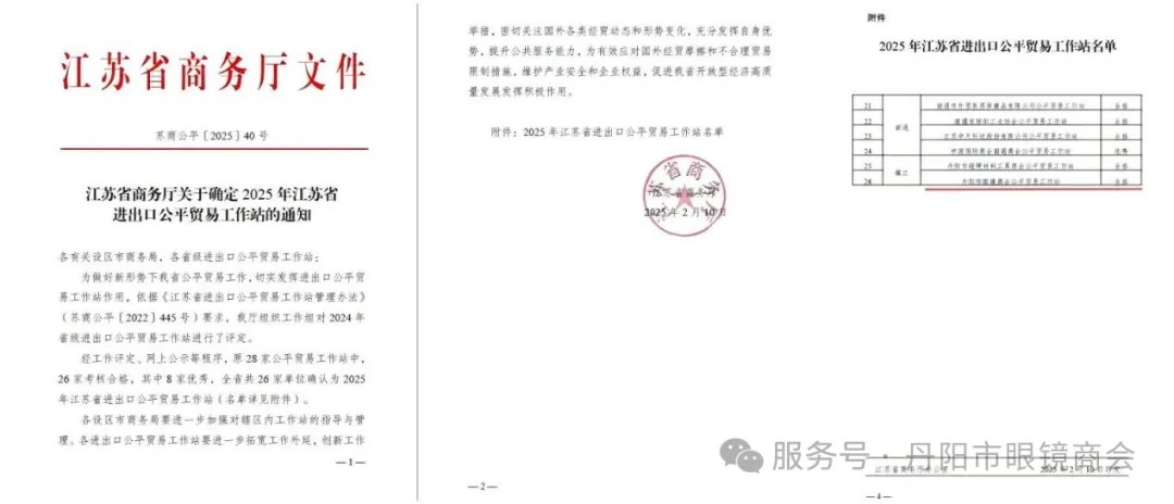 2025年2月10日,丹阳市眼镜商会公平贸易工作站通过考核被确定为2025年省进出口公平贸易工作站