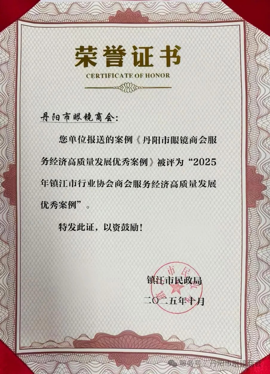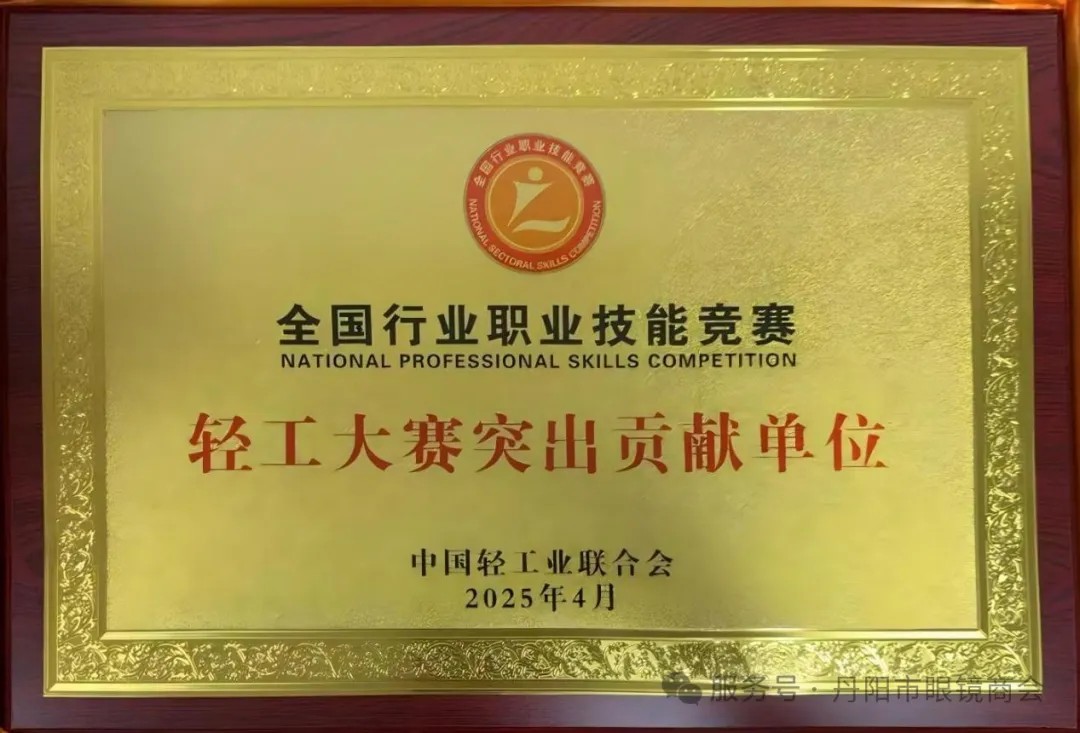 2025年4月,丹阳市眼镜商会被中国轻工业联合会全评定为全国行业职业技能竞赛“轻工大赛突出贡献单位”。