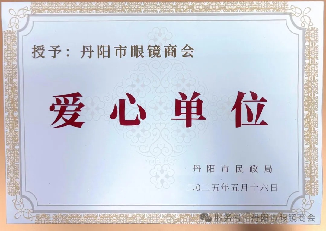 2025.5.16,丹阳市眼镜商会被丹阳市民政局授予“爱心单位”荣誉称号。