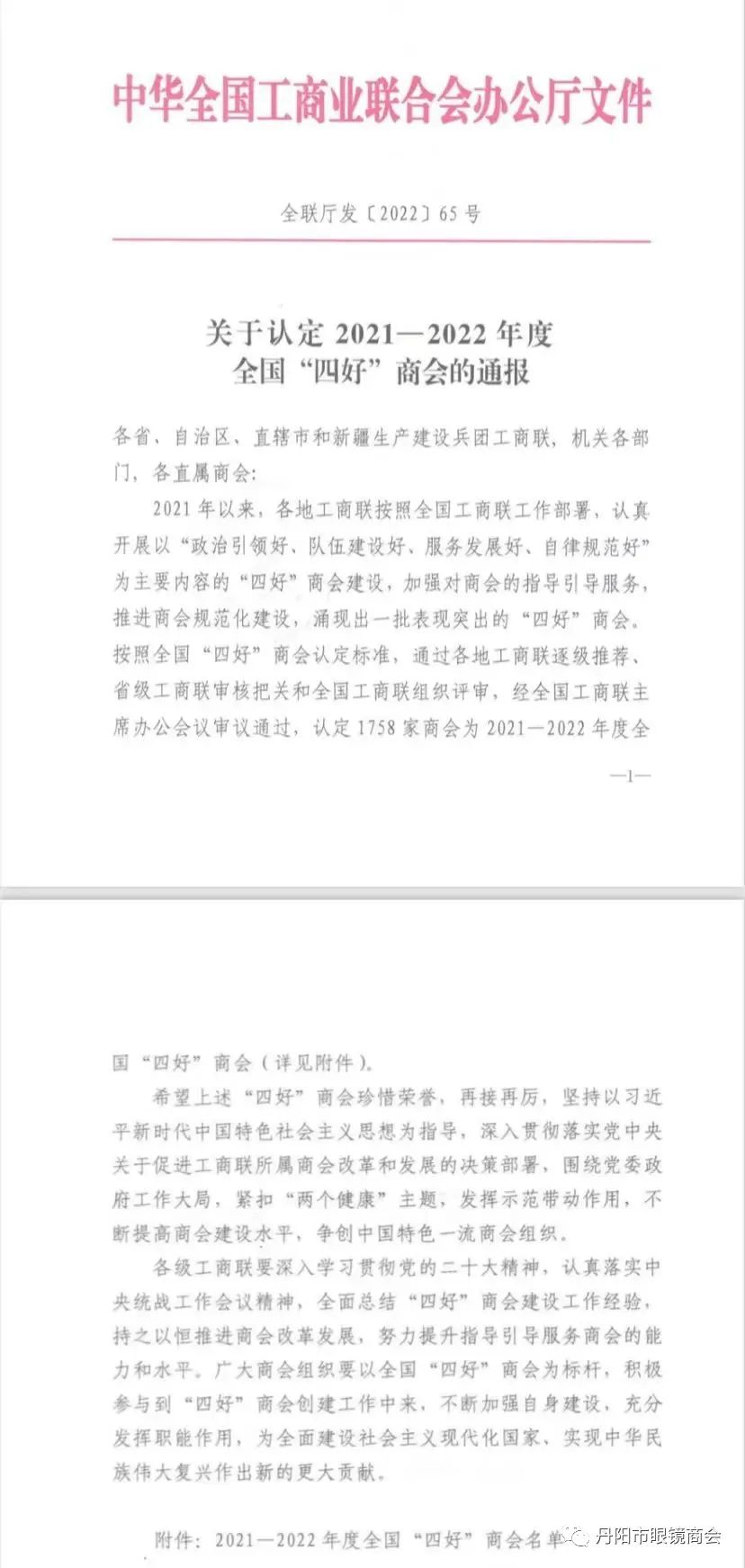 根据全国工商联《关于认定2021-2022年度全国“四好”商会的通报》(全联厅发〔2022〕65号),丹阳市眼镜商会被认定为2021-2022年度全国“四好”商会。这是自2017年以来,丹阳市眼镜商会获评“全国四好商会”殊荣的第六个年度!