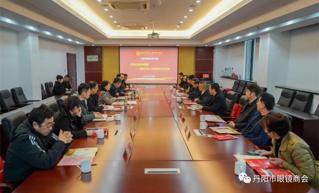 为推动丹阳眼镜行业发展,促进产教融合,全面推行校企协作、共同育才,12月8日,由丹阳市司徒镇政府、丹阳市眼镜商会联合南京师范大学中北学院在中北学院正德楼会议室召开“丹阳企业家进校园——视光行业人才培养研讨交流会”。