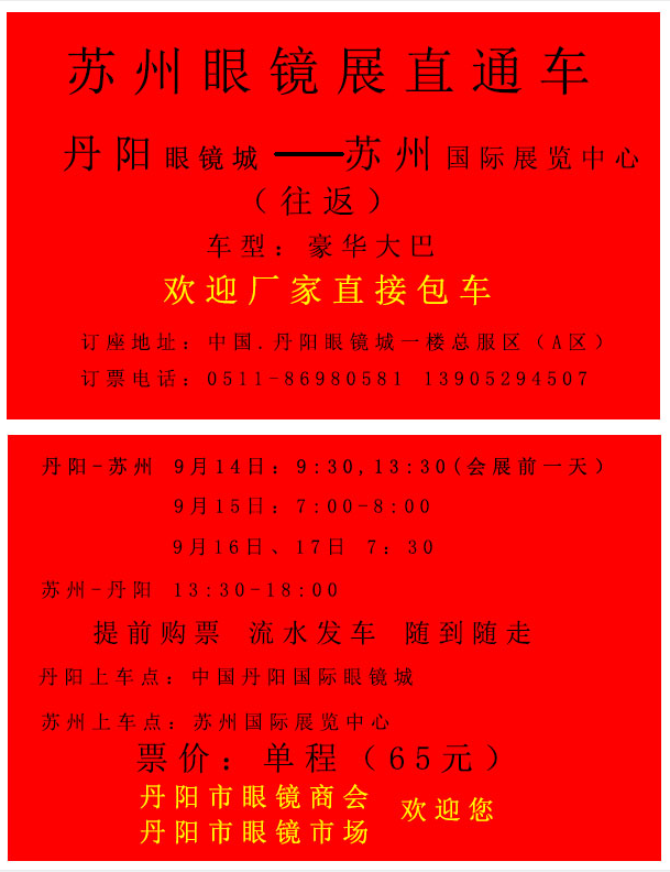 2022年苏州国际眼镜业展览会将于2022年9月15日~17日在苏州国际博览中心举办,为方便各会员企业出行苏州参、观展,丹阳市眼镜商会现已开通“展会便企直通车”——(丹阳⇋苏州展馆)直达往返客车、货运专项包车服务,以解参展会员企业后顾之忧。