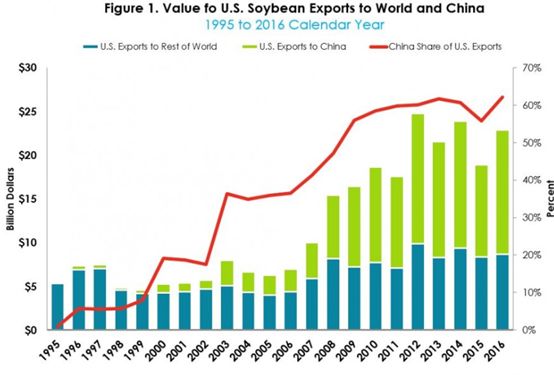 ▲图为美国从1995年到2016年出口给全世界和中国的大豆情况,可以看到中国是美国大豆产业中最大且无法替代的市场