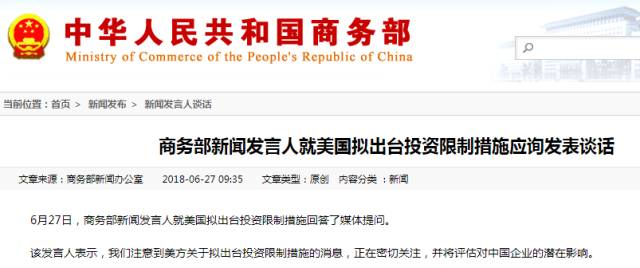 针对美国拟出台投资限制措施,商务部新闻发言人27日就此回答了媒体提问,该发言人表示,我们注意到美方关于拟出台投资限制措施的消息,正在密切关注,并将评估对中国企业的潜在影响。