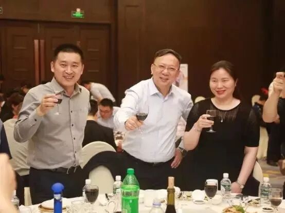爱尔眼科医院集团副总裁、视光及小儿眼科事业部总监杨智宽先生(中)、万新光学集团总裁汤峰先生(左),视光及小儿眼科事业部副总监杨积文女士(右)共同举杯