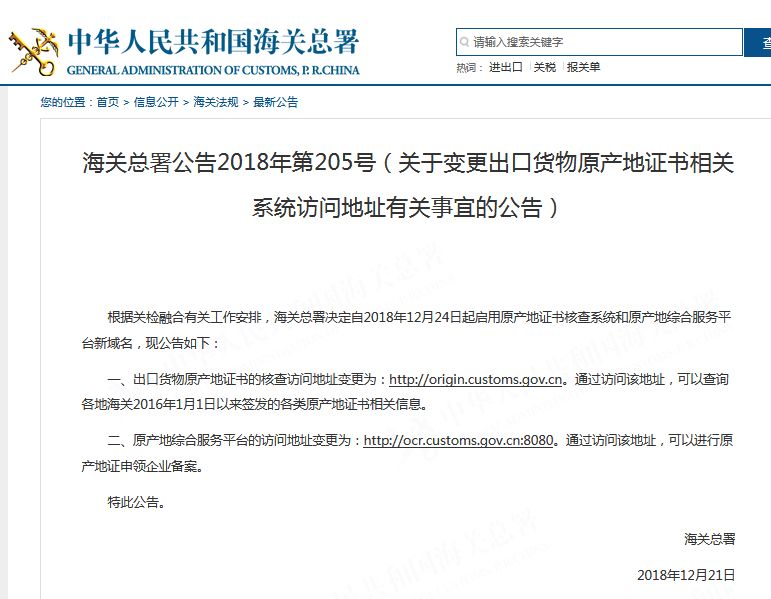 根据关检融合有关工作安排,海关总署决定自今日(12月24日)起启用原产地证书核查系统和原产地综合服务平台新域名。