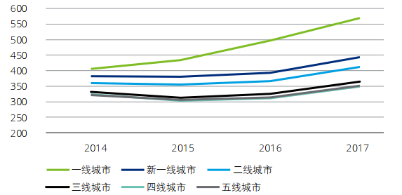 1-5线城市消费者在天猫国际的人均消费比较(单位:元),数据来源:阿里研究院