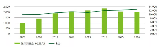 进口消费品规模不断升高。纵观2011年至2017年的中国进口消费品市场,进口消费品总额受总体进口额的影响出现略微浮动,消费品进口在进口商品中占比稳步增长。根据世界银行的数据统计,2011-2016年间中国进口消费品的占比一直维持总进口额的10%以上。这样的变化不仅来源于中国对进口消费品的旺盛需求,也反映出国家正在逐步将国民境外消费引流到国内消费的政策导向。
