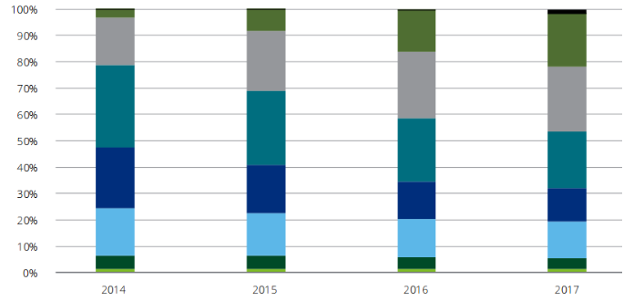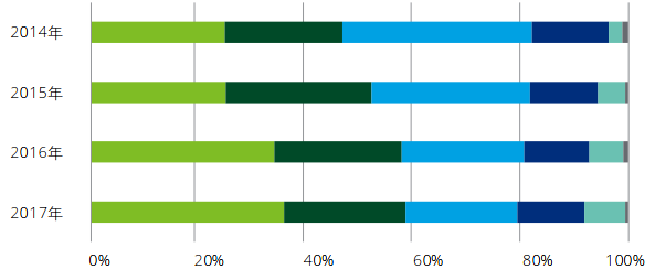 2014-2017按出生年代划分的跨境电商消费者人数占比,数据来源:阿里研究院