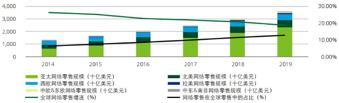 全球网络零售发展趋势,数据来源:eMarketer、德勤研究