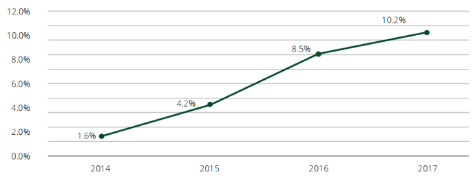 2014年,跨境电商零售进口刚刚起步,跨境电商零售进口渗透率(指通过跨境电商购买进口商品的人数占网购消费者人数的比率)仅有1.6%。随着跨境电商平台崛起,以及中国消费升级进程加速,2017年,跨境电商零售进口渗透率已经迅速增加到10.2%,跨境电商零售进口消费群体迅速扩大。2017年天猫国际消费者人数是2014年的10倍,并且这一趋势仍将继续平稳增长下去。