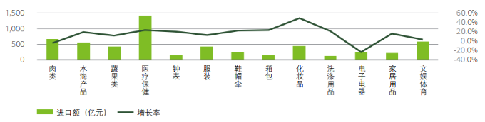 2017年进口消费品细分类进口额和增长率一览,数据来源:中国海关,德勤研究
