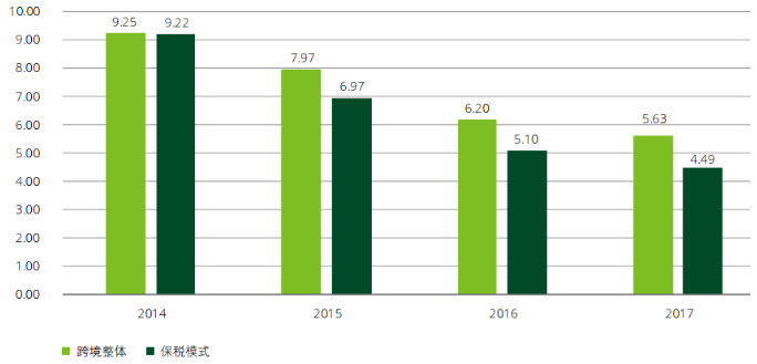 随着跨境电商保税模式的平稳发展,以及商家运营模式的逐渐成熟,跨境电商购物体验大幅提升。天猫国际的平均收货时间从2014年的9.25天缩短到了2017年的5.63天,其中保税模式的平均收货时间从2014年的9.22天缩短到2017年的4.49天,效率提升了一倍以上。