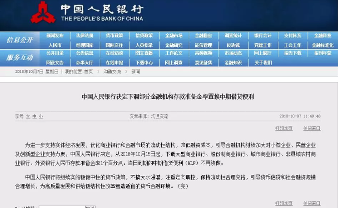 导 读:10月7日中午,央行发文表示,从2018年10月15日起,下调大型商业银行、股份制商业银行、城市商业银行、非县域农村商业银行、外资银行人民币存款准备金率1个百分点,当日到期的中期借贷便利(MLF)不再续做。