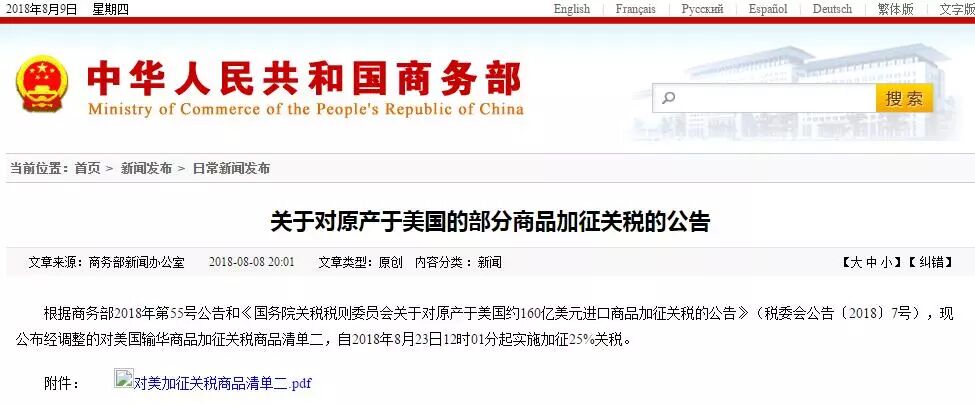 根据商务部2018年第55号公告和《国务院关税税则委员会关于对原产于美国约160亿美元进口商品加征关税的公告》(税委会公告〔2018〕7号),现公布经调整的对美国输华商品加征关税商品清单二,自2018年8月23日12时01分起实施加征25%关税。
