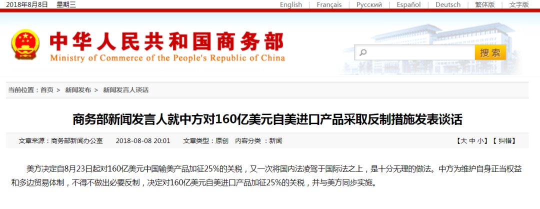针对美方决定自8月23日起对约160亿美元中国输美产品加征25%的关税,商务部新闻发言人8日发表谈话指出,美方这一行为又一次将国内法凌驾于国际法之上,是十分无理的做法。中方为维护自身正当权益和多边贸易体制,不得不做出必要反制,决定对约160亿美元自美进口产品加征25%的关税,并与美方同步实施。